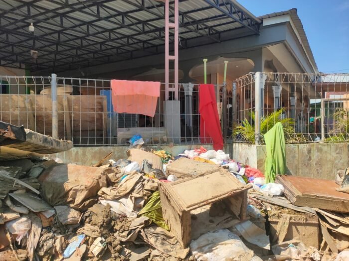 Pantauan di lapangan menunjukkan, lorong-lorong sempit di kawasan tersebut belum sepenuhnya pulih. Kasur, lemari kayu, kursi, pakaian, hingga puing rumah tangga rusak masih berserakan di depan rumah warga. Lumpur kecokelatan menempel di dinding dan lantai rumah, menyisakan aroma tak sedap dan potensi gangguan kesehatan.